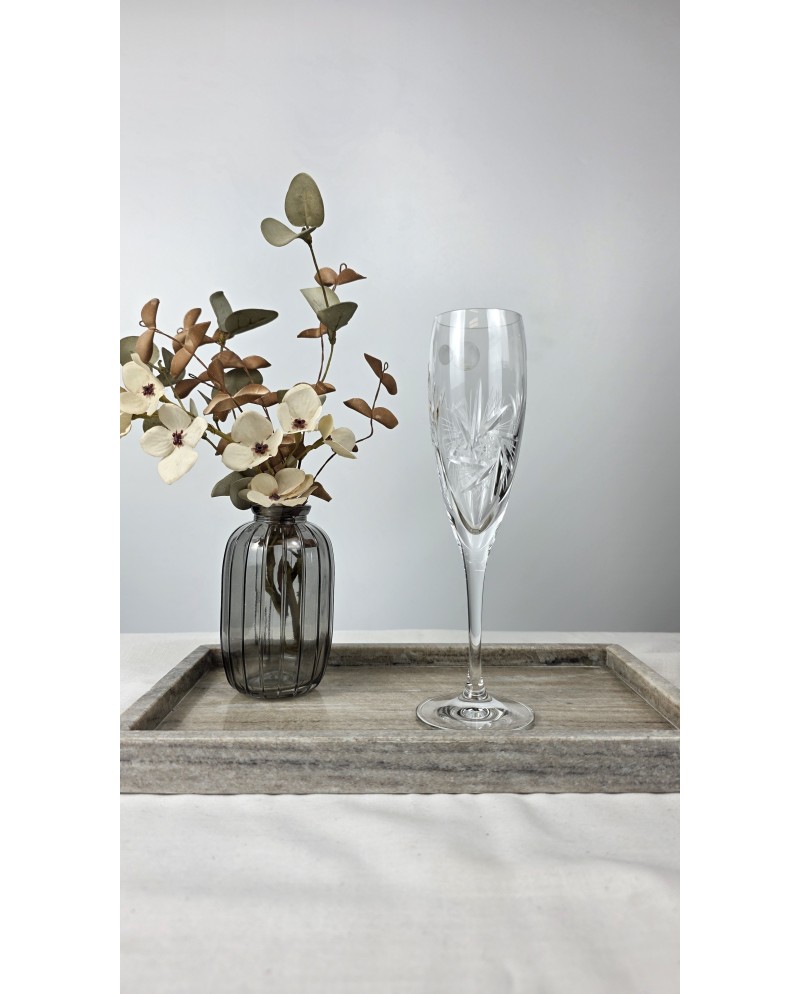 Zestaw 6 kieliszków kryształowych Edit Glass do szampana – szlif młynek Elegancki zestaw sześciu kieliszków do szampana od Edit Glass to połączenie wyrafinowanej formy i rzemieślniczej precyzji. W Kotlinie Kłodzkiej – regionie, który od pokoleń słynie z mistrzów zdobnictwa szkła – każdy kieliszek powstaje w procesie ręcznego szlifowania i kwaszenia. Smukła, ciągnięta noga nadaje kieliszkom lekkości i subtelnej elegancji, a szlif młynek pięknie odbija światło, wydobywając naturalny blask kryształu. Cechy zestawu: Ilość: 6 kieliszków do szampana Materiał: szkło kryształowe (24% pbo), ręcznie zdobione Technika zdobienia: szlif młynek + trawione kwasem Wysokość kieliszka: 22,5 cm Średnica czarki: 5 cm Smukła, ciągnięta noga – elegancka forma i wygoda użytkowania Precyzyjne, ręczne wykonanie w Kotlinie Kłodzkiej Oryginalny produkt firmy Edit Glass Made in Poland Zestaw idealny na uroczyste toasty, wesela, święta czy wyjątkowe okazje. Podkreśli rangę spotkań i sprawi, że serwowanie szampana, prosecco czy win musujących stanie się prawdziwą celebracją.