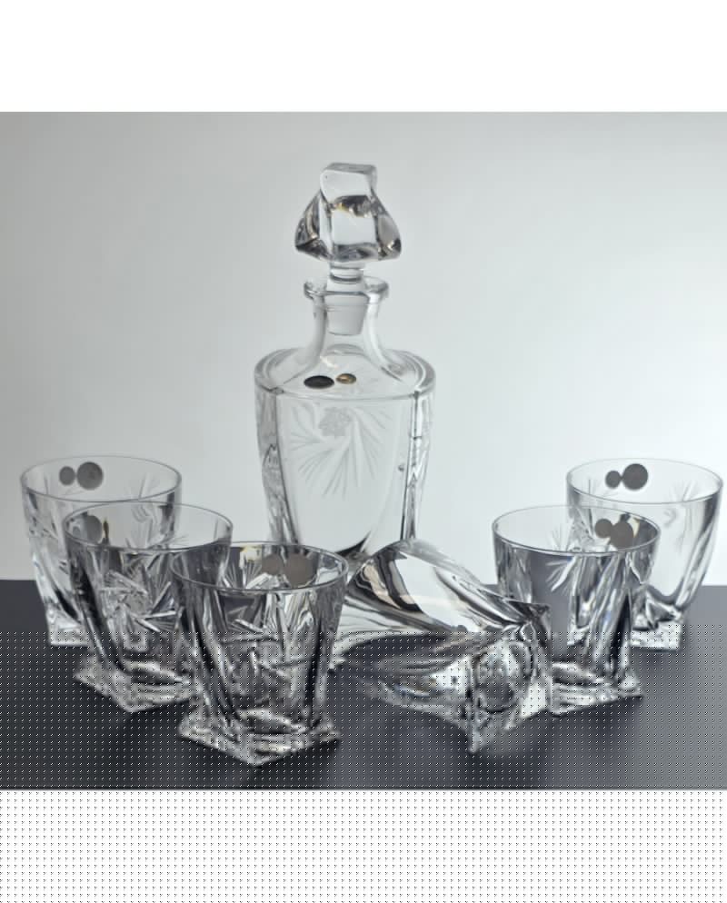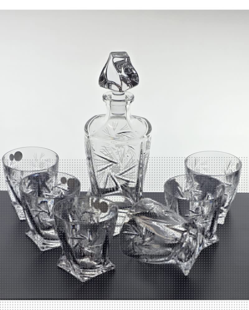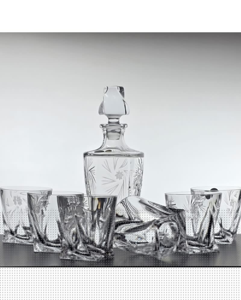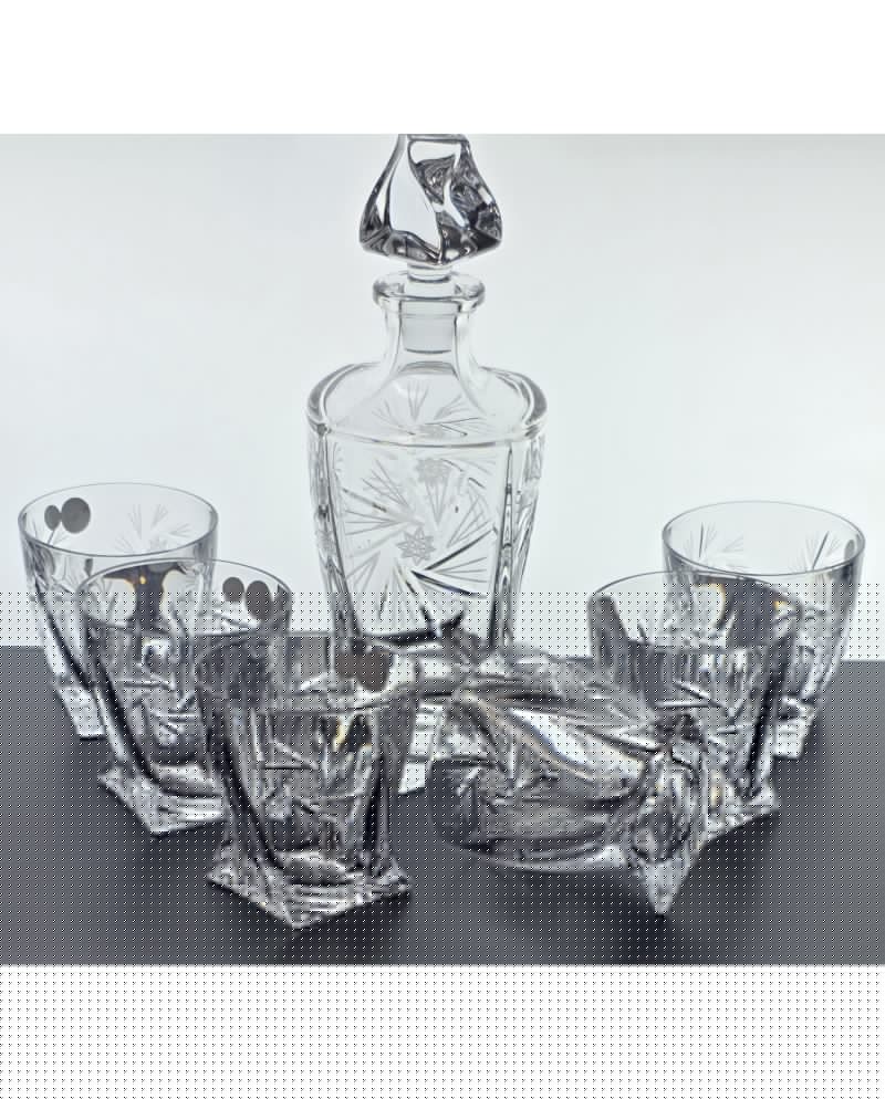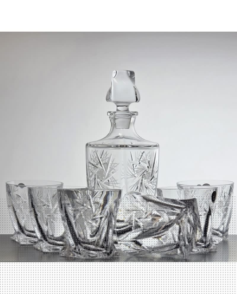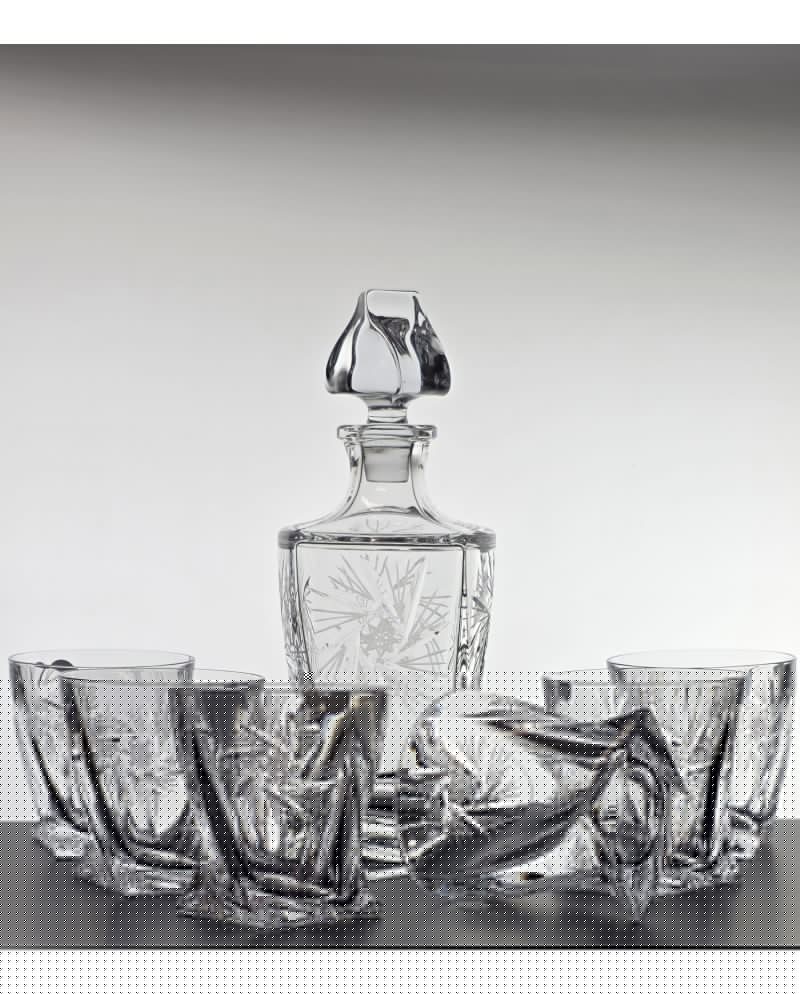 Karafka Quadro zachwyca dynamiczną formą i geometrycznymi liniami, które pięknie załamują światło. Szklanki do whisky idealnie komponują się z nią, tworząc spójną i stylową całość. Szlif Młynek dodaje elegancji i podkreśla tradycyjny charakter zestawu, nawiązując do klasycznych wyrobów polskich hut szkła.