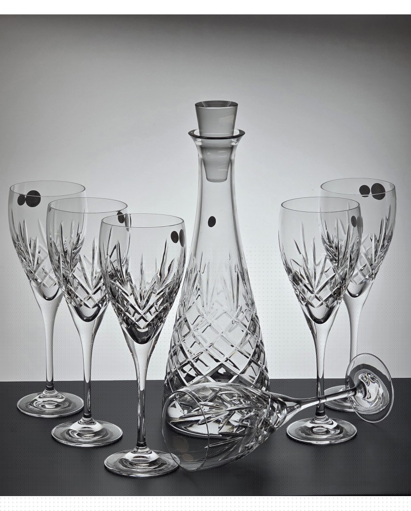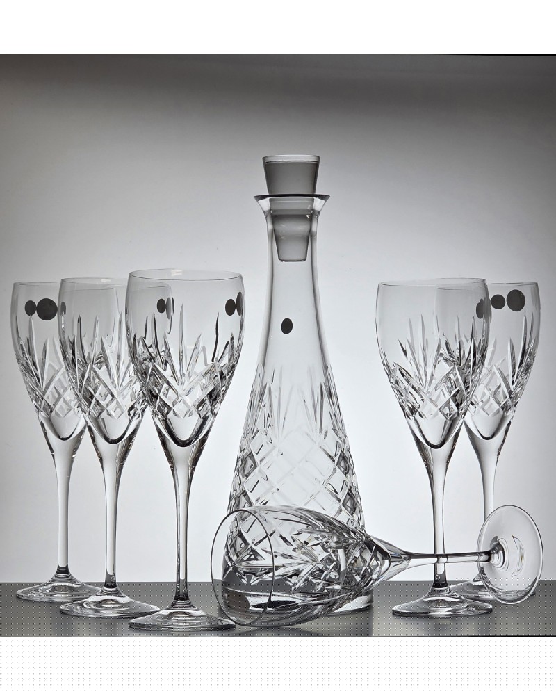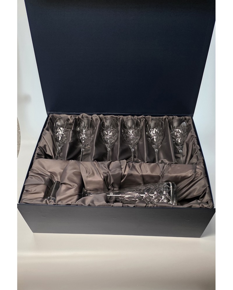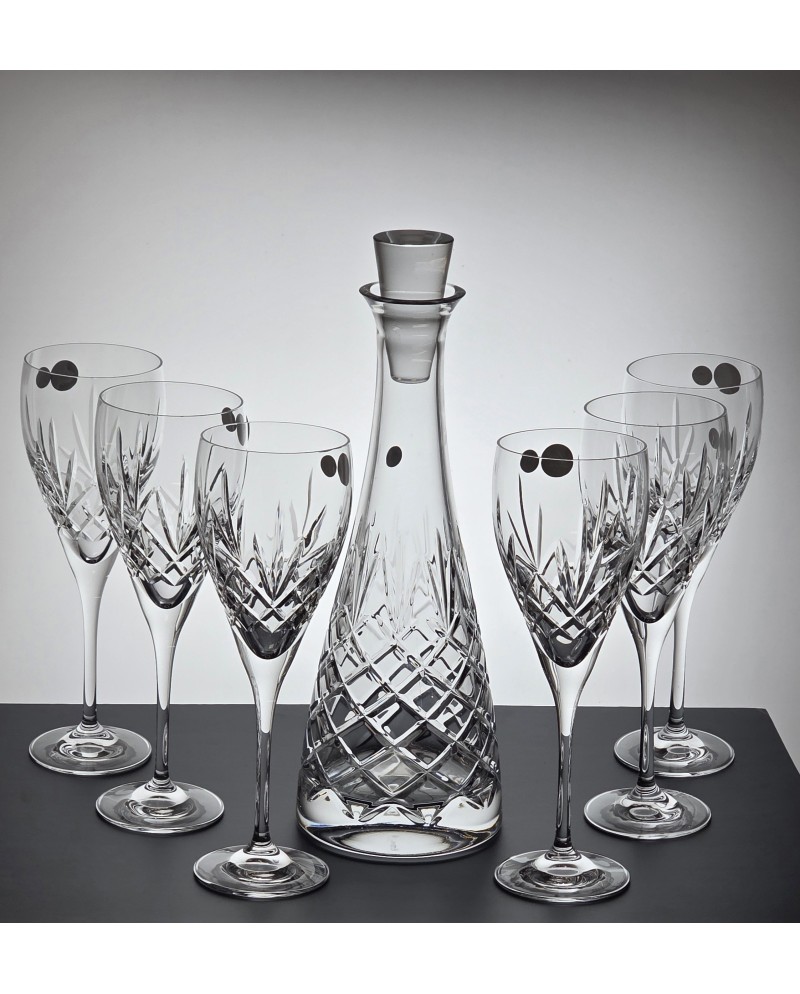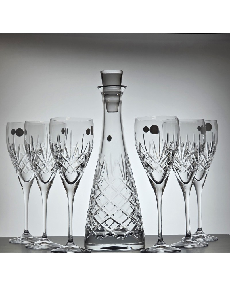 Parametry produktu: Producent: Edith (Polska) Linia / Szlif: ANANAS Materiał: szkło kryształowe. Zawartość zestawu: karafka kryształowa + 6 kieliszków kryształowych do wina Wysokość karafki: 34,3 cm Szerokość karafki: 11,7 cm Pojemność karafki: 700 ml Wysokość kieliszka: 23,5 cm Średnica kieliszka: 7,5 cm Pojemność kieliszka: 340 ml Kraj pochodzenia: Polska Opakowanie ozdobne pudełko wyłożone atlasem.
