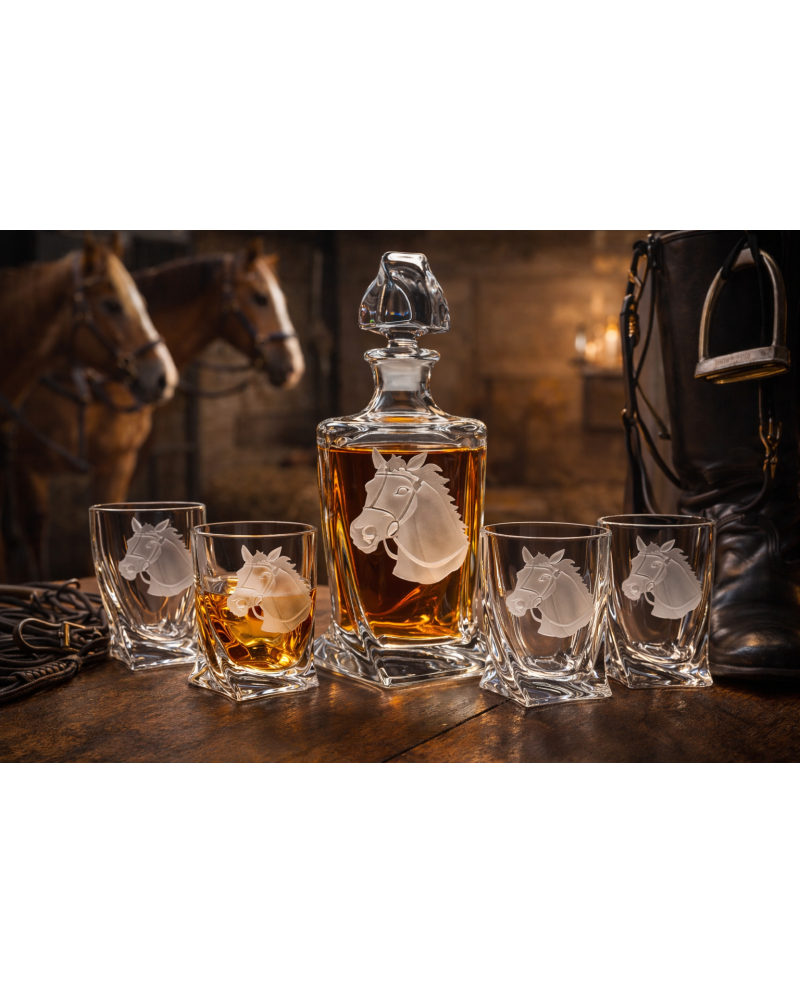 Centralnym elementem kompletu jest precyzyjnie wykonany motyw łba konia, który nadaje karafce i szklankom wyjątkowej estetyki. Koń od wieków symbolizuje siłę, wolność i elegancję, dlatego zestaw z tym motywem doskonale wpisuje się w gust osób poszukujących niebanalnych dodatków do wnętrz.