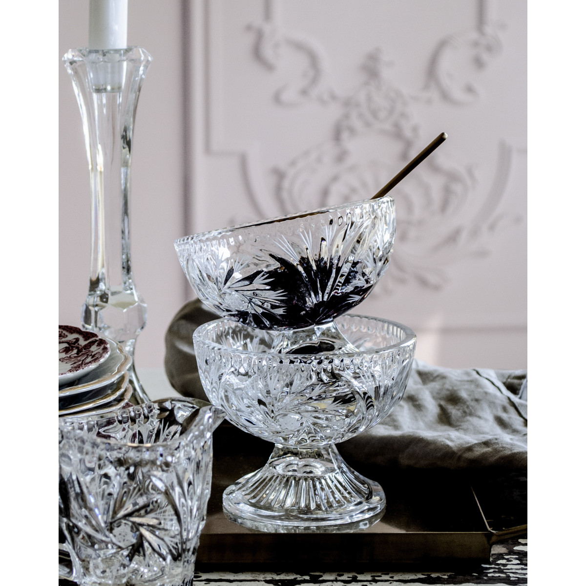 Mała misa na nóżce ze szkła kryształowego. Może służyć jako pucharek na lody i desery lub jako naczynie środka stołu na dipy i przystawki, a także dżemy, konfitury, miód, masło, kremowy twarożek typu Philadelphia i przeróżne pasty do pieczywa. W łazience sprawdzi się jako naczynie do odkładania biżuterii. Młynek Szlif darzony w Polsce wielkim sentymentem. Królował na stołach naszych babć - pamiętamy świeże kwiaty z ogródka w wazonie zdobionym Młynkiem i świąteczny kompot w kompotierkach z tym właśnie motywem. W dzieciństwie częstowano nas cukierkami z dekorowanych Młynkiem bombonierek i koszyczków, a te zachwycały nas magicznymi, świetlnymi refleksami. Dziś Młynek pięknie prezentuje się w połączeniu z minimalistycznym serwisem stołowym w naturalnych barwach oraz lnianym obrusem, czy serwetkami, a także gładkim szkłem i prostymi szlifami. Dynamiczny, radosny szlif rozświetli każde wnętrze i błyskawicznie poprawi nam nastrój. Młynek został opatentowany w USA w 1899 roku, jednak jego początków należy doszukiwać się w połowie XIX wieku na Dolnym Śląsku. Jego formę najlepiej oddaje angielskojęzyczna nazwa "pinwheel", czyli "wiatraczek". Wysokość: 8,5 cm Średnica: 11 cm
