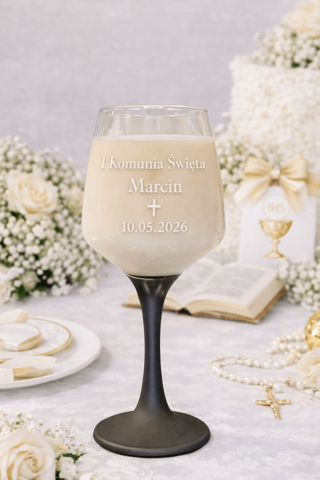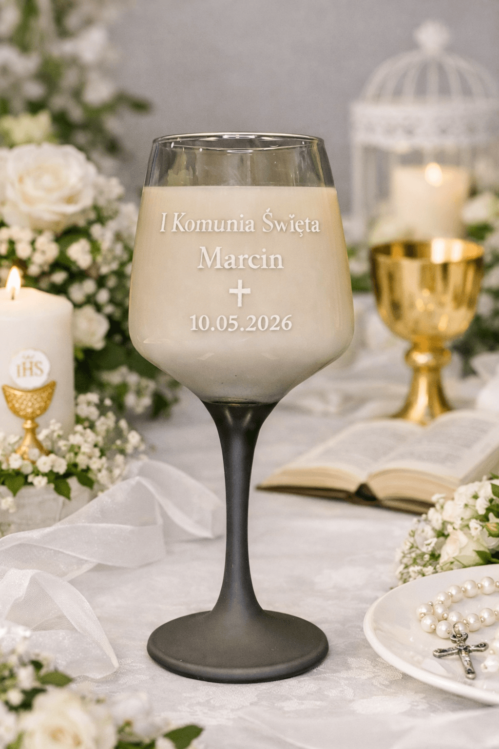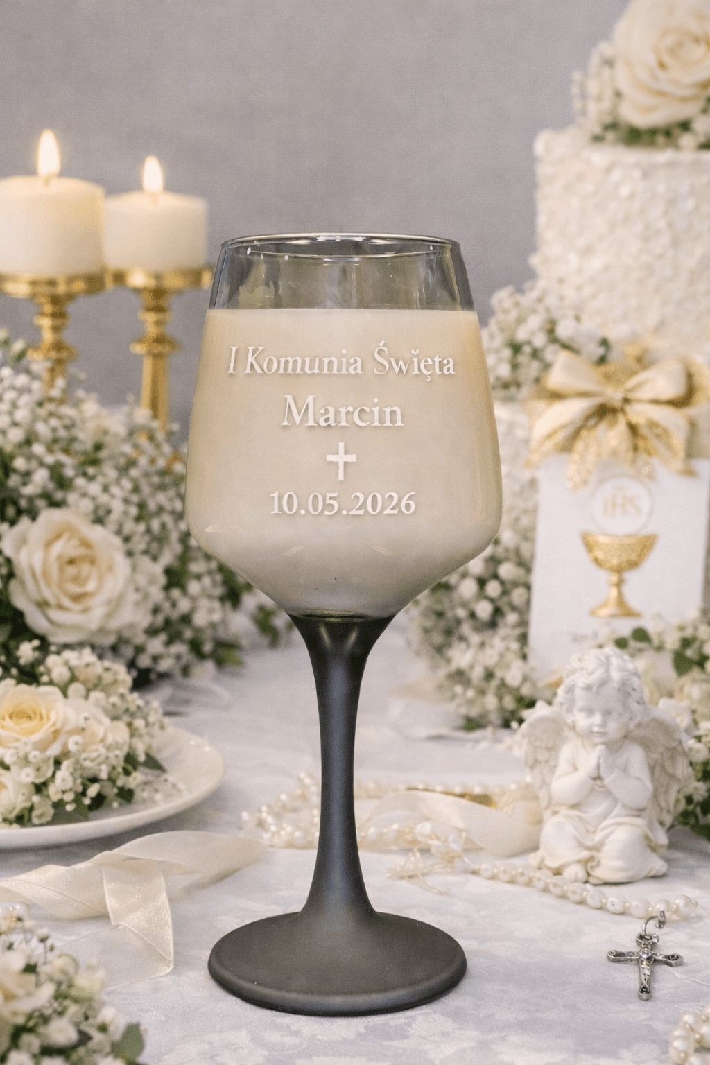 Szklany kieliszek o smukłej formie został ozdobiony piaskowanym napisem komunijnym, który może zawierać napis „I Komunia Święta”, imię dziecka, datę uroczystości oraz symbol krzyża ✝. Dzięki temu każda świeca staje się indywidualną i wyjątkową dekoracją, idealnie wpisującą się w charakter uroczystości.