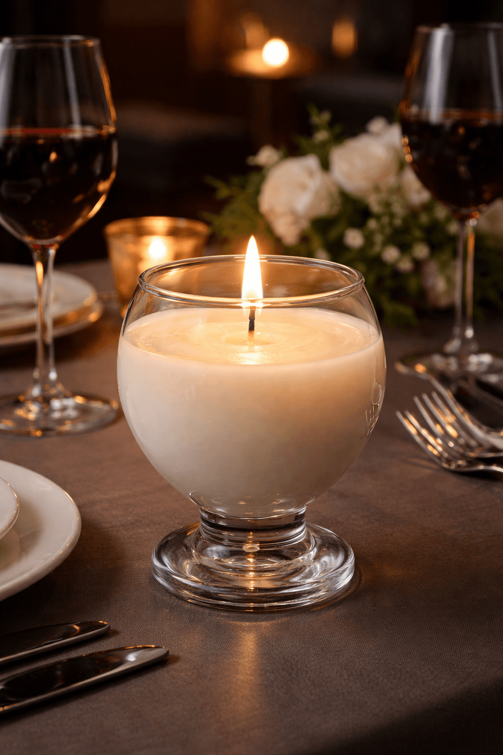 Dzięki eleganckiej formie świeca wygląda jak element zastawy stołowej, dlatego świetnie sprawdza się jako dekoracja stołu w restauracji, hotelu czy salonie SPA. Delikatne światło płomienia buduje przytulny nastrój i podkreśla charakter wnętrza.
