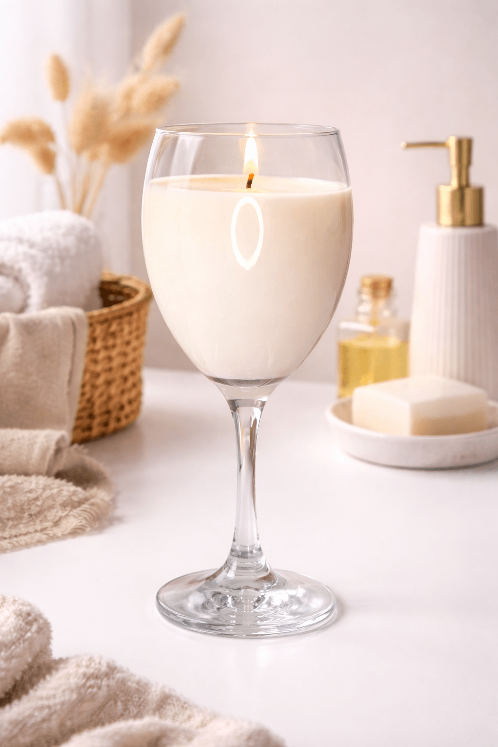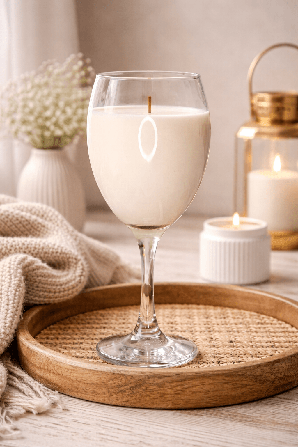 Transparentne szkło pięknie eksponuje wosk sojowy, a wysoka nóżka kieliszka nadaje całości lekkości i elegancji. Po zapaleniu świecy powstaje ciepłe, nastrojowe światło, które podkreśla klimat wnętrza i tworzy wyjątkową atmosferę.