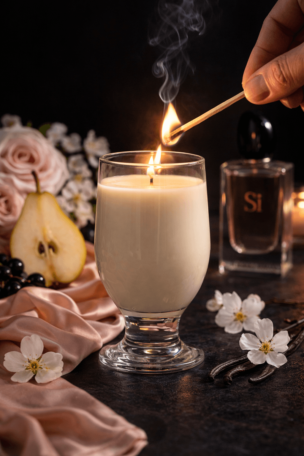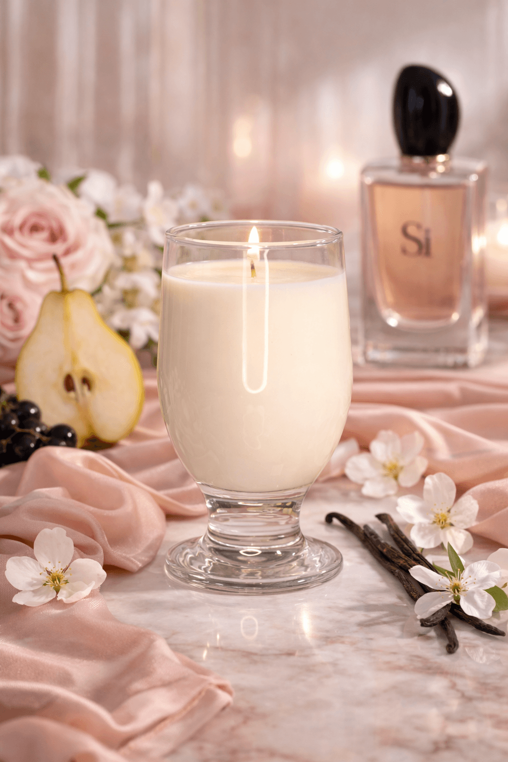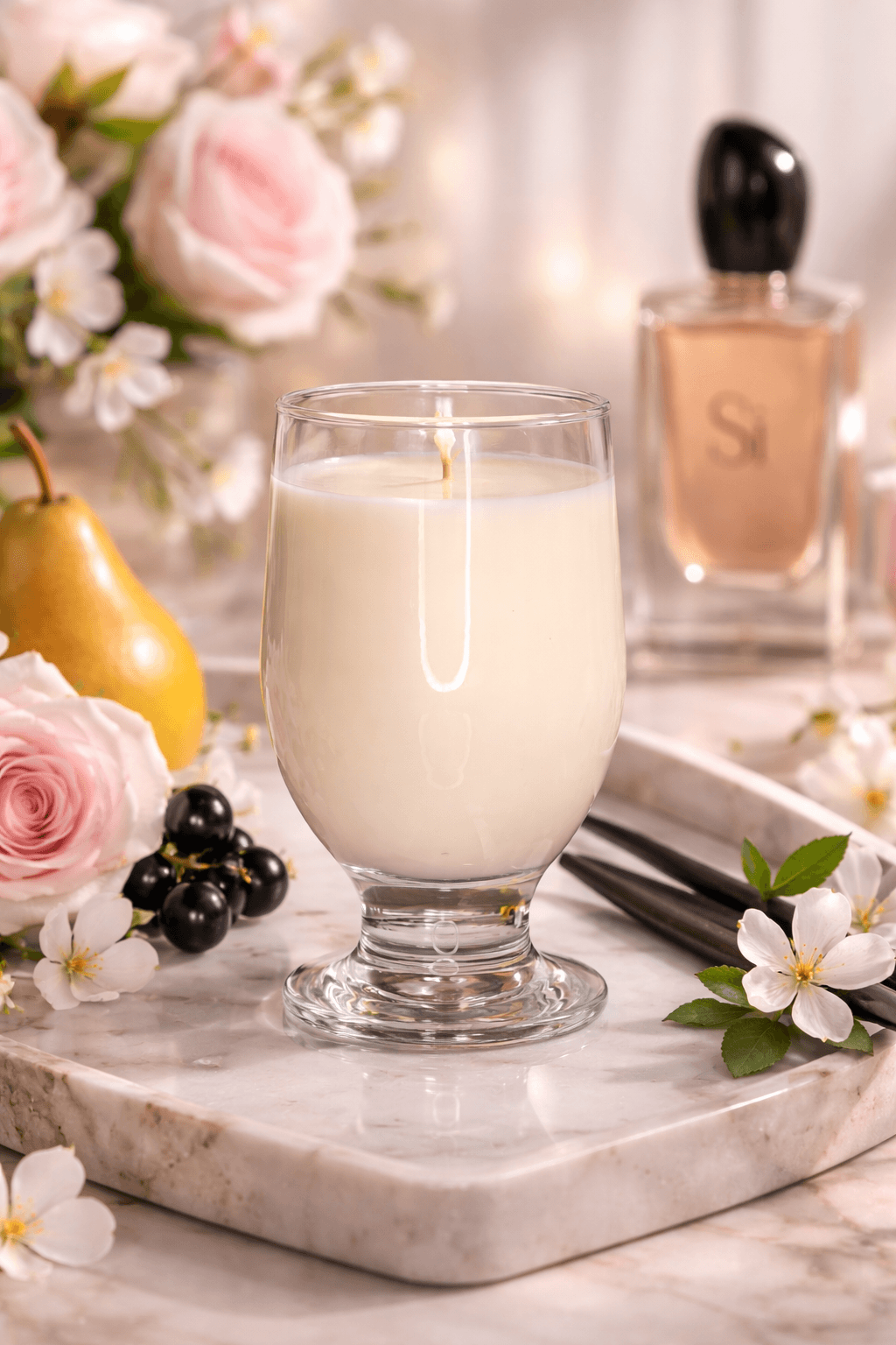 Velvet Si Essence to wyjątkowa świeca zapachowa w szkle, która przenosi zmysły w świat luksusowych, kobiecych aromatów. Kompozycja zapachowa została zainspirowana znanym profilem perfum damskich typu Giorgio Armani Si, łącząc w sobie wyrafinowaną słodycz owoców, subtelność kwiatów oraz głębię waniliowo-paczulowej bazy.