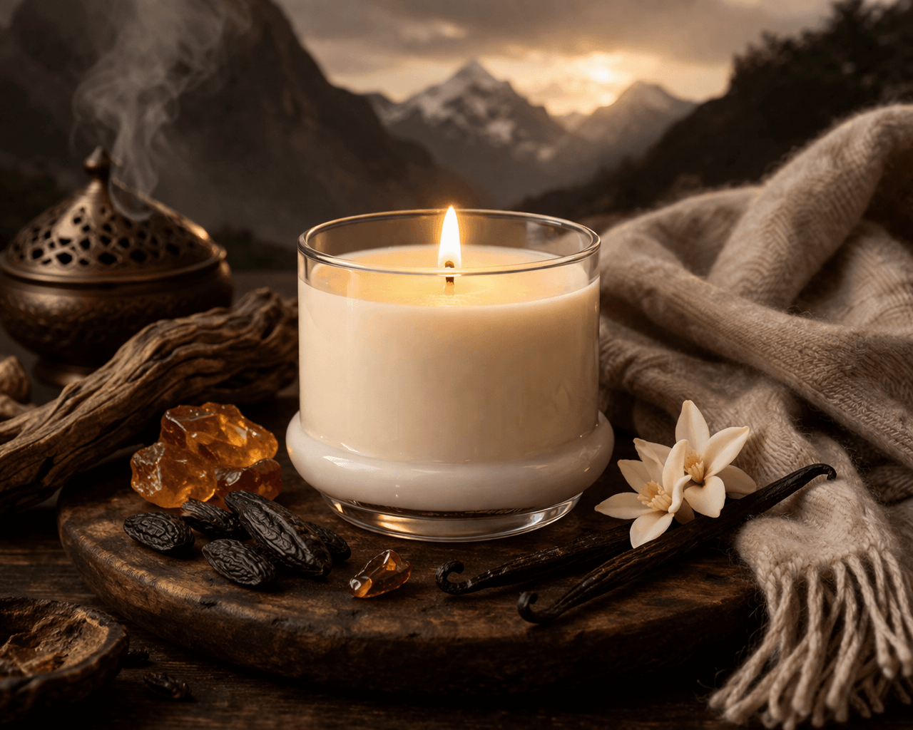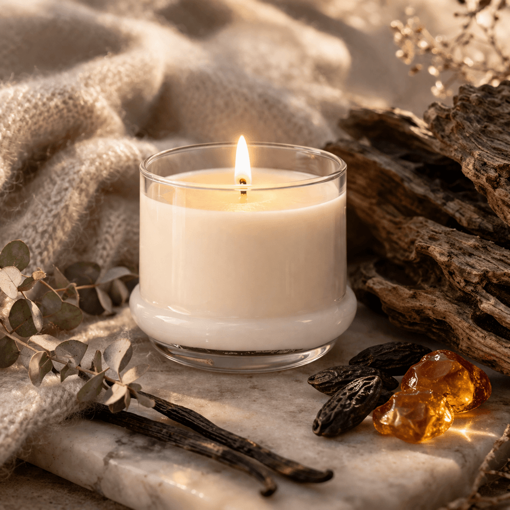 Po zapaleniu świeca uwalnia ciepłe akordy ambry i wanilii, które płynnie przechodzą w aksamitną tonkę i miękki kaszmir, tworząc atmosferę luksusu i komfortu. Całość dopełniają delikatne nuty drzewne i żywiczne, nadające zapachowi głębi i trwałości.