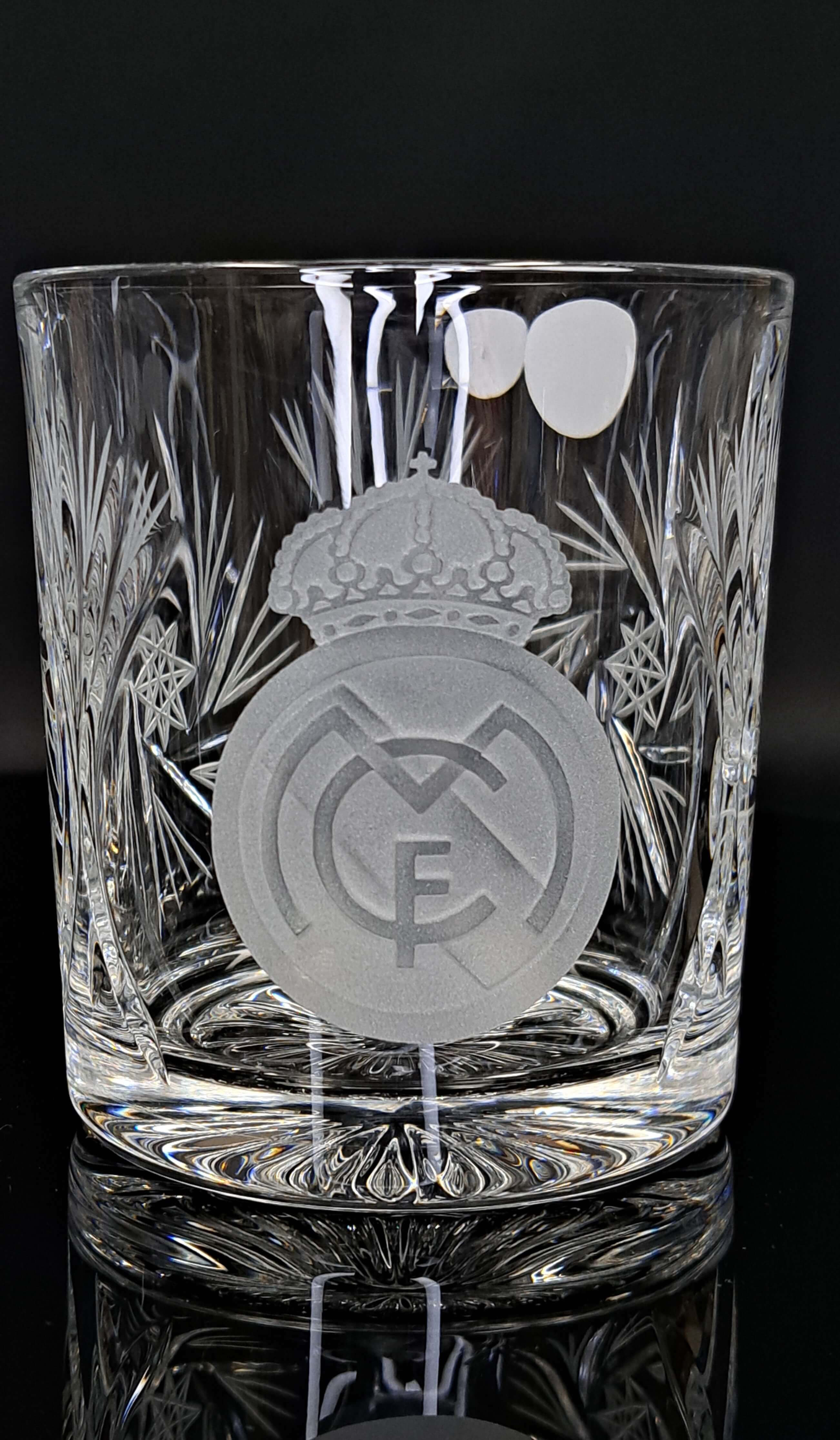 Ekskluzywny zestaw kryształowych szklanek do whisky z eleganckim wykonanym ręcznie grawerem herbu klubu Real Madryt to propozycja dla osób, które cenią połączenie sportowej pasji, luksusu i rzemieślniczego wykonania. Klasyczna forma typu szklanki proste – szlif młynek nadaje im ponadczasowy charakter i podkreśla wyjątkowy styl szkła kryształowego.