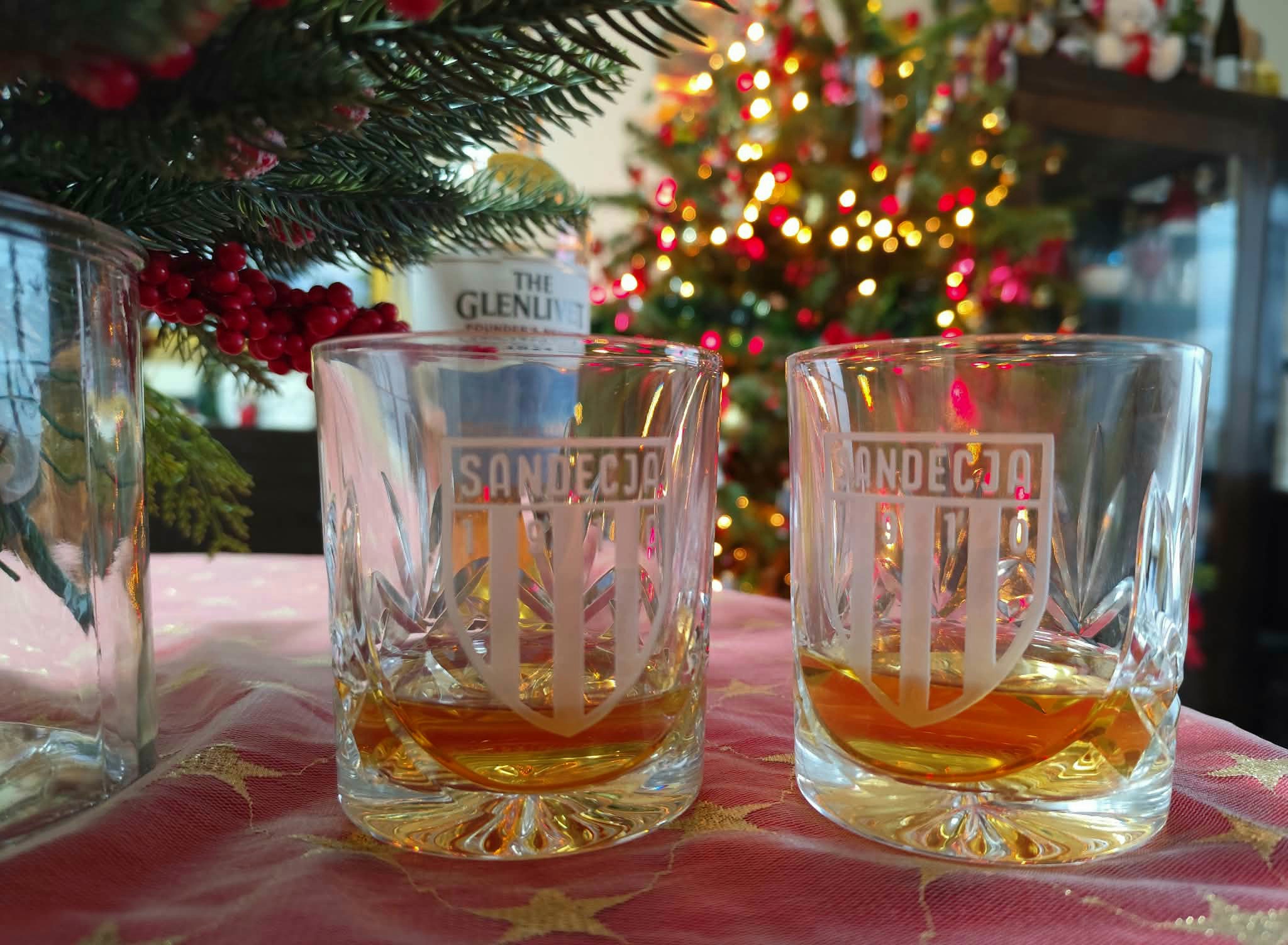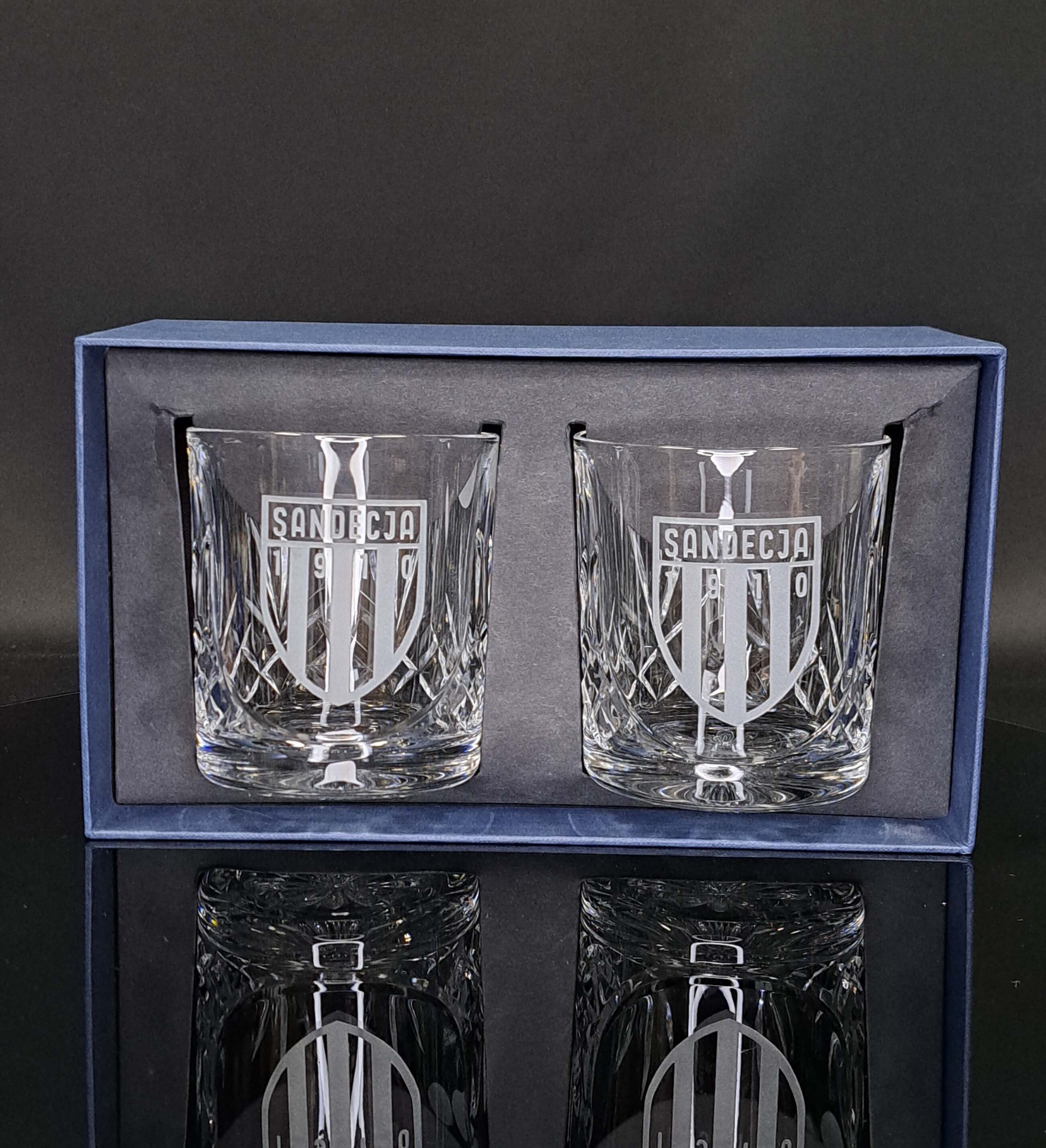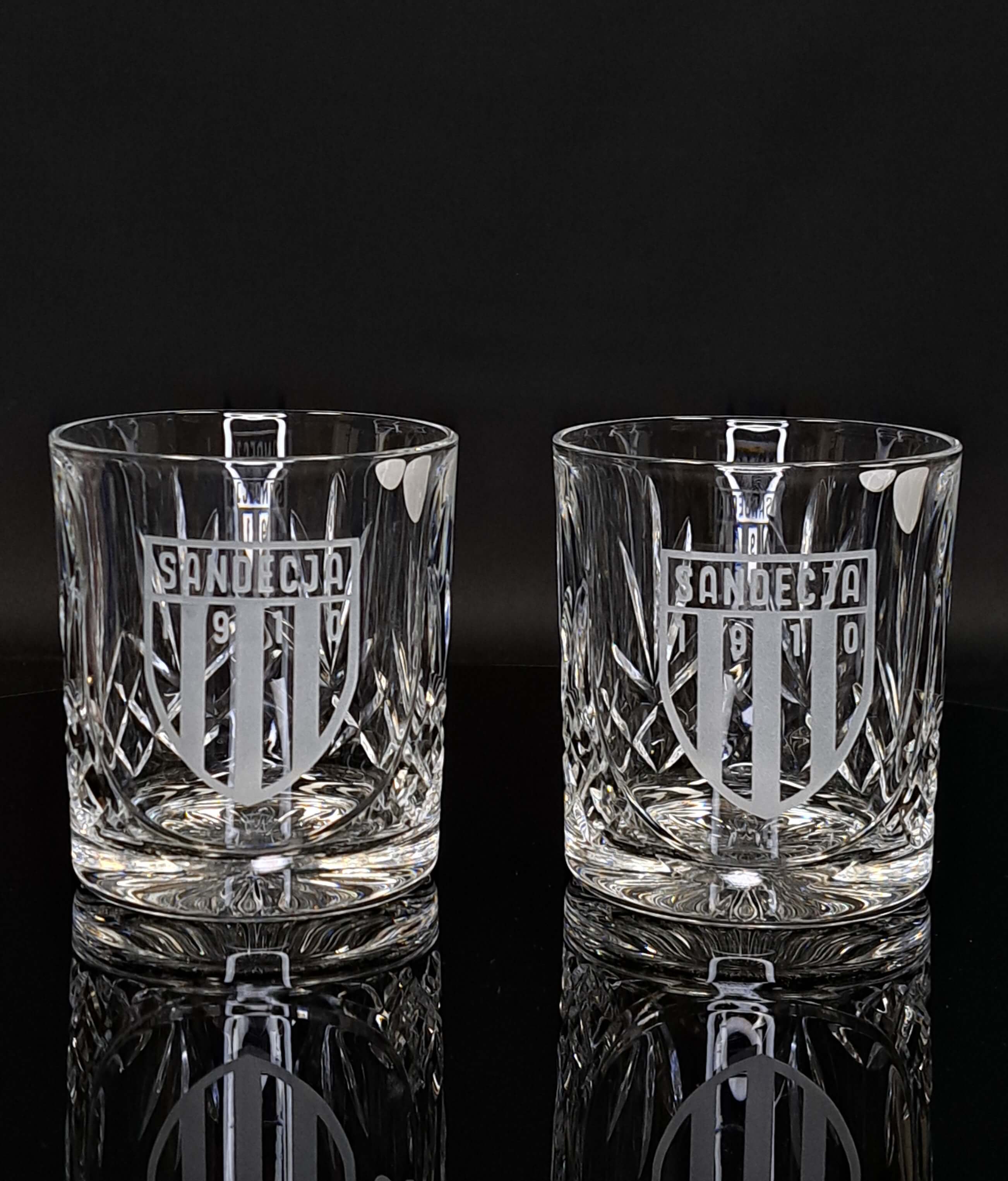 szklanki kryształowe z grawerem herbu Sandecja Nowy Sącz