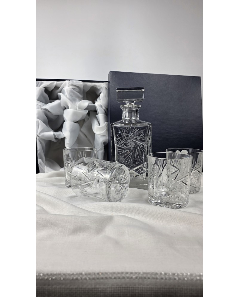 Zestaw prezentowy Edit Glass – karafka i cztery szklanki w szlifie młynek Elegancki zestaw prezentowy od Edit Glass to połączenie tradycji hutniczej ze sztuką polskiego zdobnictwa szkła. W Kotlinie Kłodzkiej – miejscu, które od pokoleń słynie z mistrzów rzemiosła – powstają unikatowe wyroby zachwycające przejrzystością i blaskiem. Każdy element zestawu zdobiony jest ręcznie w klasycznym szlifie młynek, a następnie kwaszony, co podkreśla wyrazistość wzoru i kunszt wykonania. To idealny prezent dla miłośników elegancji i wyjątkowych trunków. Cechy zestawu: Zawartość: karafka + 4 szklanki w ozdobnym opakowaniu prezentowym Materiał: szkło kryształowe, ręcznie zdobione (24% pbo) Technika zdobienia: szlif młynek + wykończenie trawione kwasem Karafka: wysokość 21 cm, szerokość 10 cm Szklanki: wysokość 9,5 cm, szerokość 8 cm Produkt rzemieślniczy z Kotliny Kłodzkiej – kolebki polskich zdobników szkła Oryginalne wykonanie firmy Edit Glass Made in Poland Zestaw idealnie sprawdzi się do serwowania whisky, wina czy innych szlachetnych trunków, a eleganckie opakowanie prezentowe czyni z niego wyjątkowy upominek na każdą okazję.
