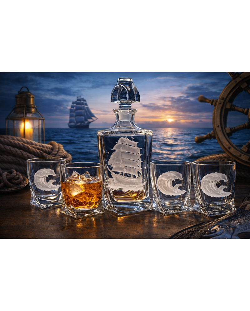 Karafka i szklanki zostały ozdobione precyzyjnym grawerem żeglarskim, który harmonijnie współgra z przejrzystością szkła. Subtelne, a zarazem wyraziste zdobienie sprawia, że zestaw prezentuje się elegancko zarówno na stole, jak i w barku czy witrynie.
